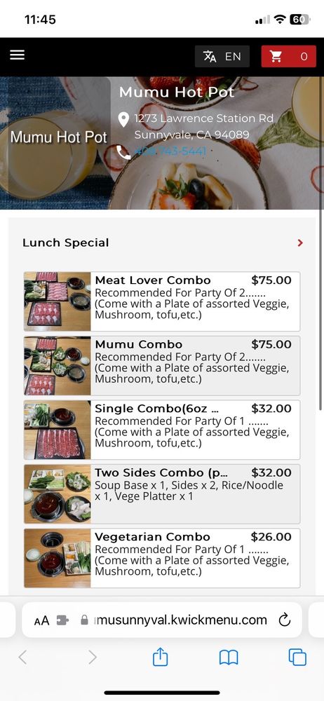 Mumu Hot Pot, located in Sunnyvale, CA, offers a Chinese hot pot experience with a focus on seafood. They provide a range of convenient amenities like reservation options, delivery services, and even vegan menu choices. Their vibrant atmosphere is casual and trendy, making it ideal for group gatherings or family outings. Customers praise the quality of the dishes, particularly highlighting the meat options and flavorful broths. The self-serve sauce bar adds a fun interactive element to the dining experience. While parking may be a challenge during peak hours, the overall consensus is positive, with guests recommending Mumu Hot Pot for special occasions or enjoyable lunches. Quality ingredients, generous portion sizes, and an inviting ambiance make Mumu Hot Pot a standout in the hot pot dining scene.